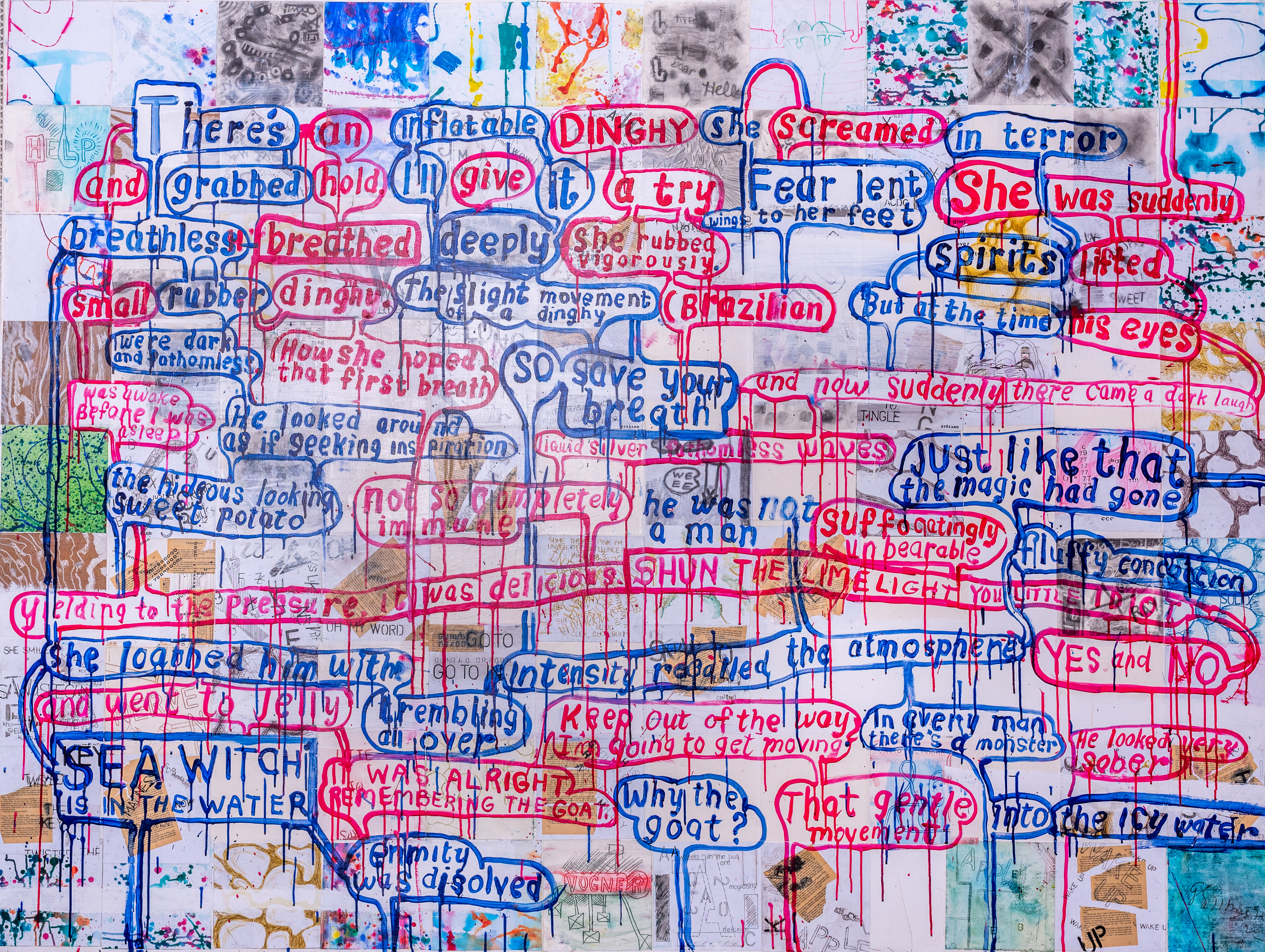 of large scale, multi-surfaced mixed media paintings by Russna Kaur,