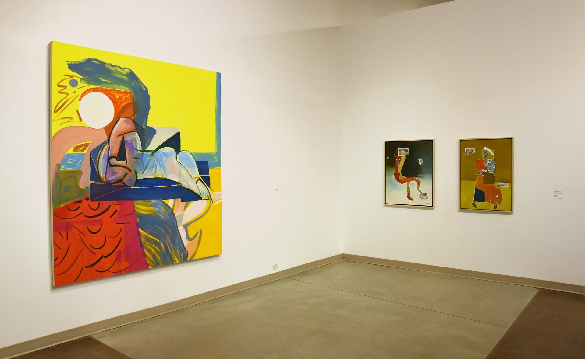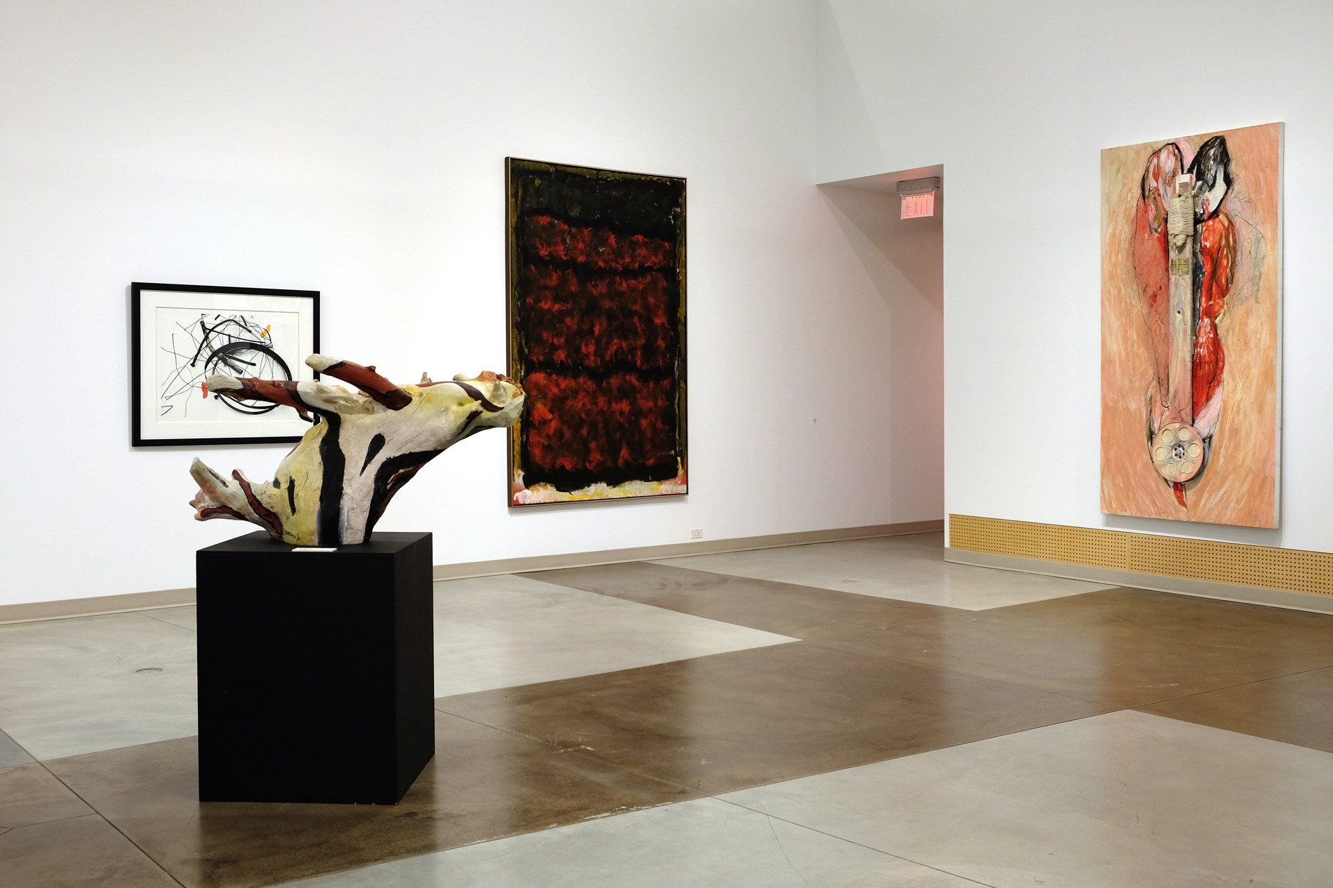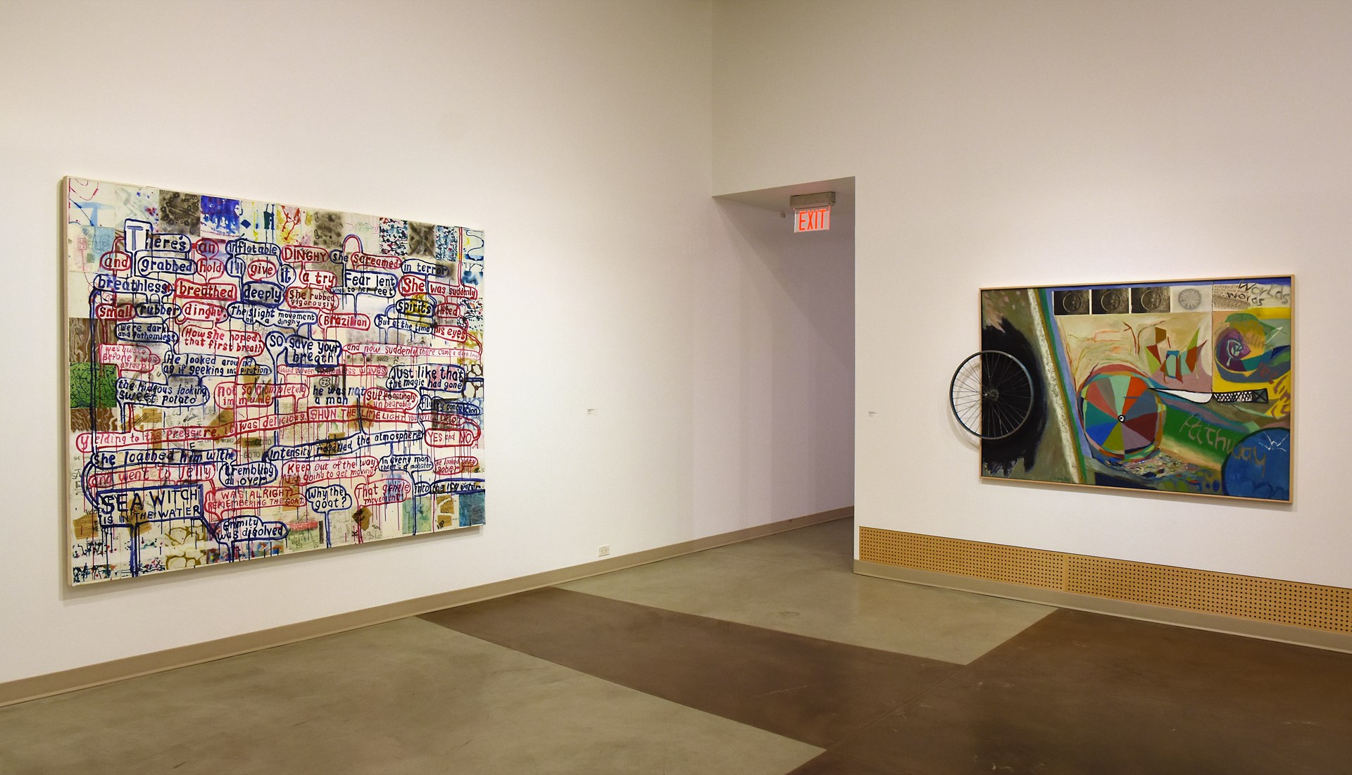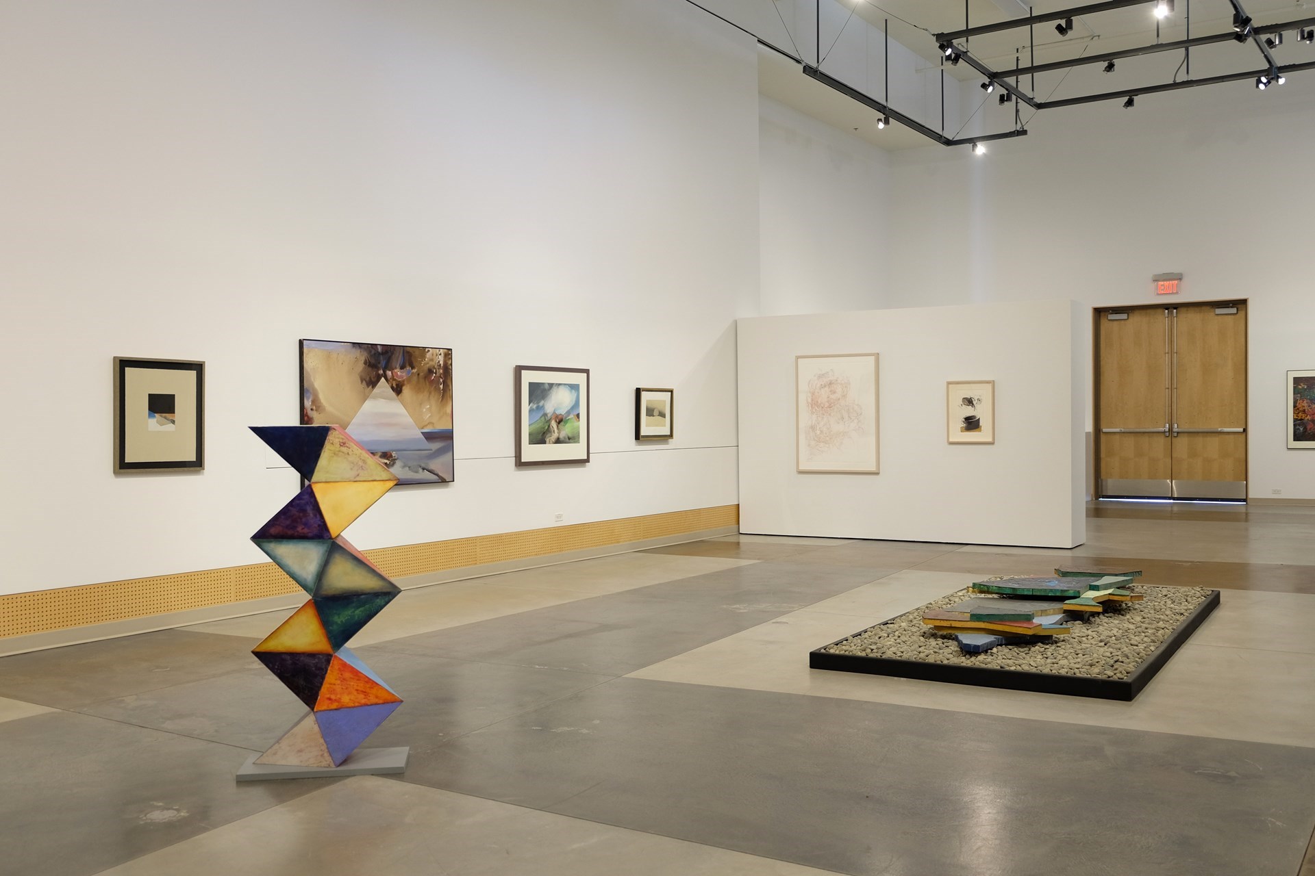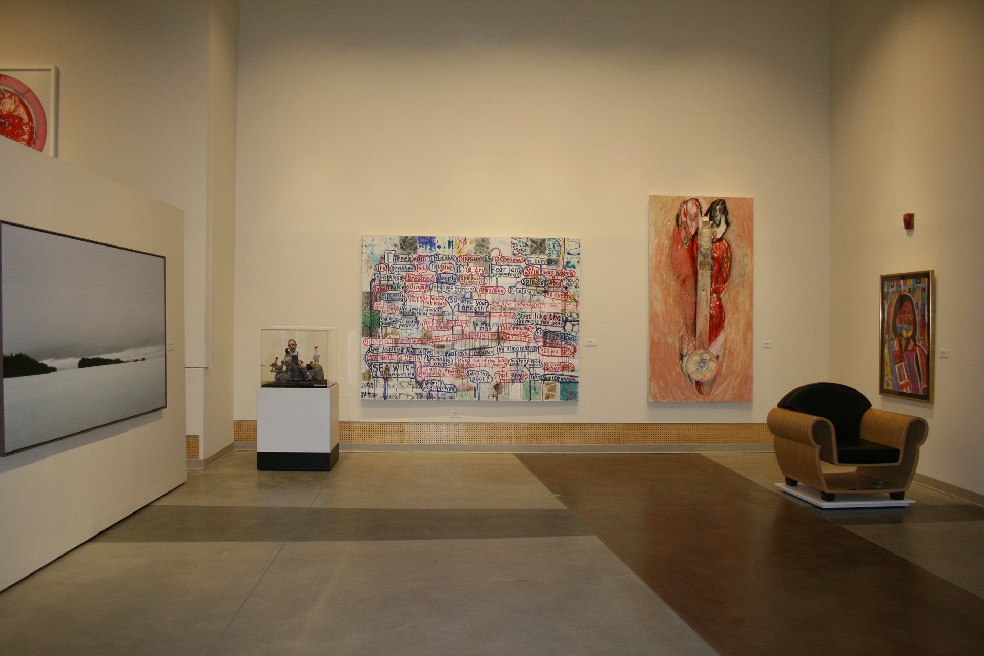 shaped cut-out paintings by M.E. Sparks, and mixed media sculptures and