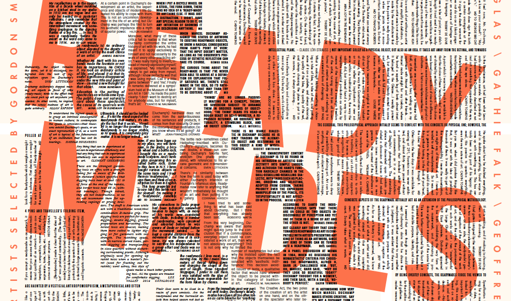 The Readymades exhibition was suggested by Gordon Smith. The impact that the 1962 Assemblage exhibition at MOMA had on Gordon Smith was revived when he saw the Duchamp show at Gagosian (New York) in 2014. Gordon transformed that experience into the notion that a group exhibition on the subject of the readymade would allow viewers a chance to reconsider the idea of the readymade in the context of local artistic practices.