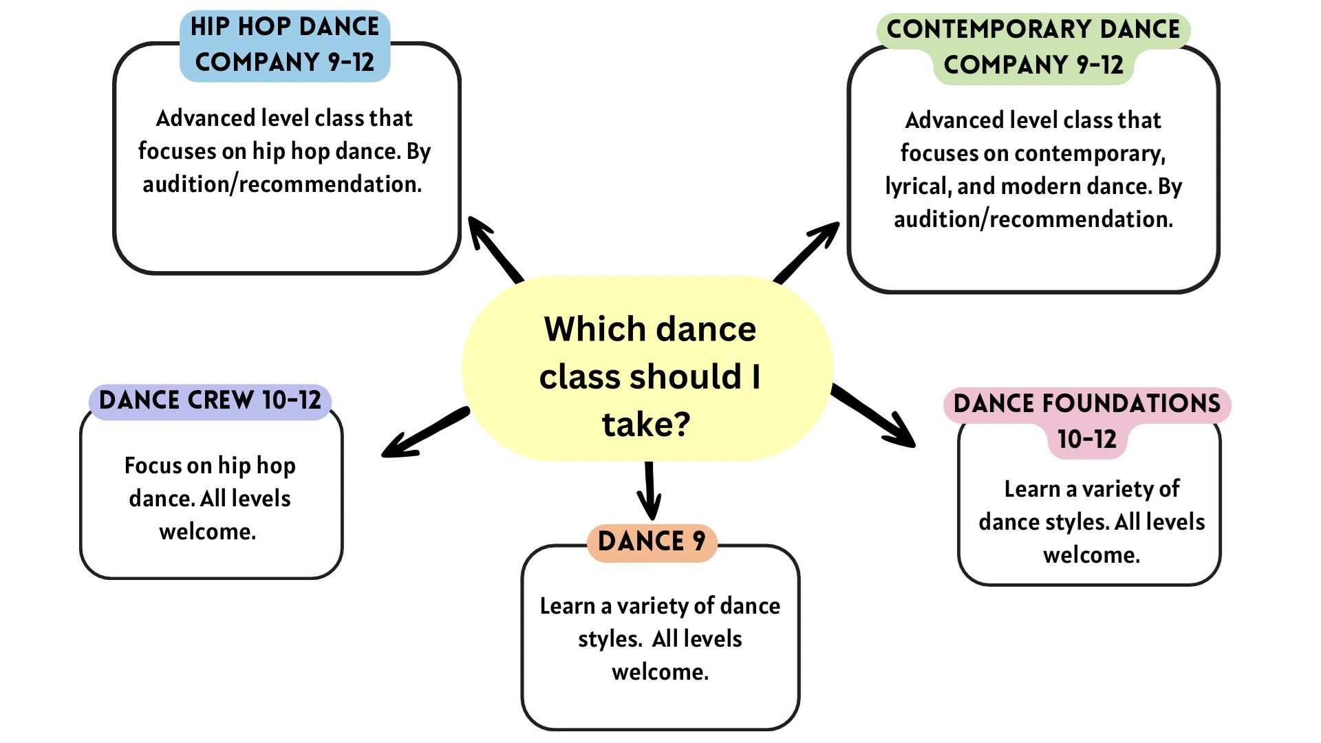 Dance Company is an advanced-level class designed for highly motivated, experienced dancers who prefer a more challenging environment. With two specialized groups, Hip Hop Dance Company and Contemporary Dance Company, students can choose to join one or both, depending on their training. Dance Company members work together as a team, preparing for competitions and showcasing their dance routines in a variety of performances throughout the year, including assemblies, sports games, video projects, community events, and the year-end show. Placement is based on a successful audition and/or teacher recommendation. Students who wish to be a part of Dance Company should select “Dance Company” during course registration, and the dance teacher will reach out at a later date to schedule an audition. Come be part of a passionate, talented team that shares your love for dance!
