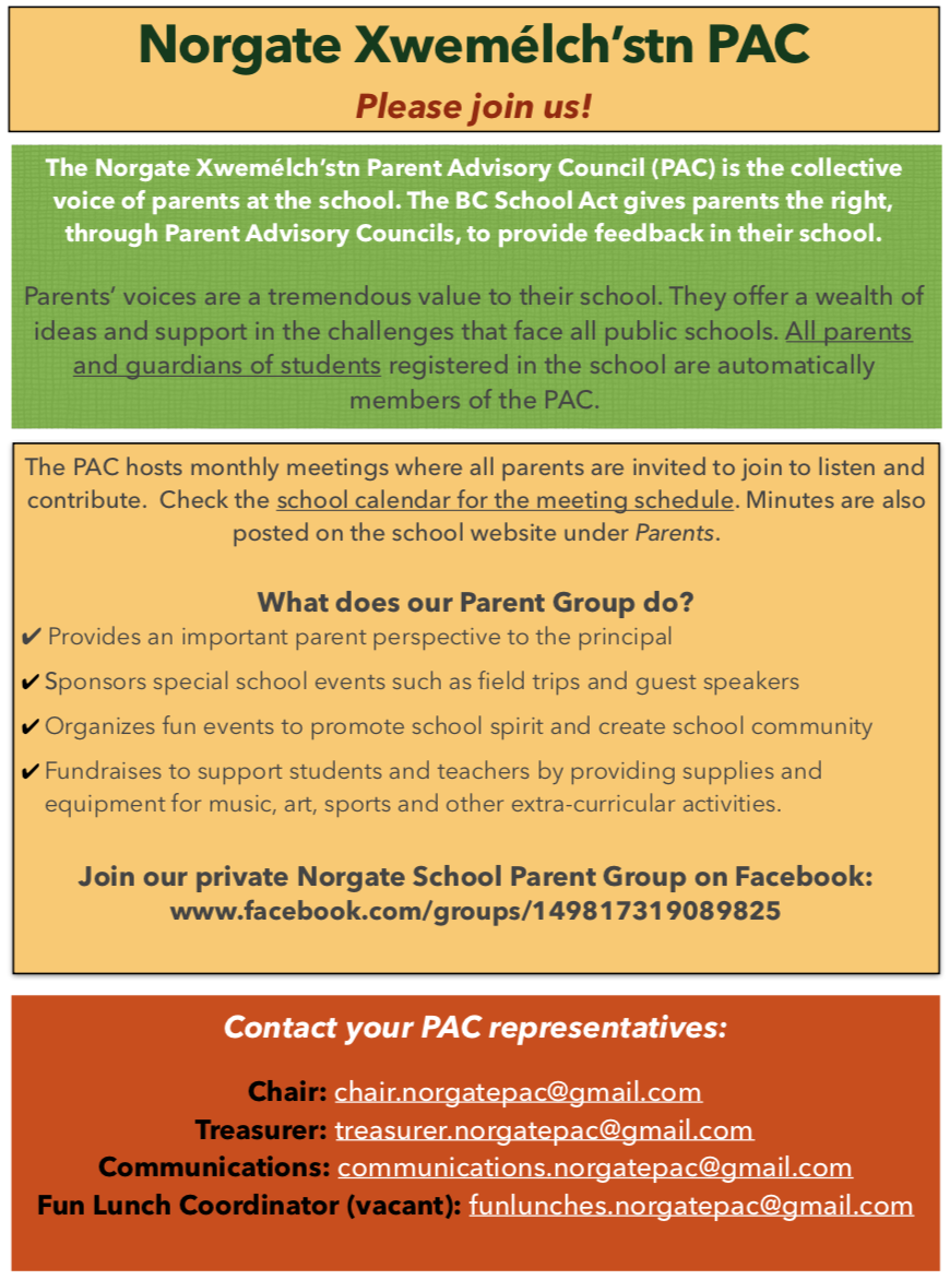 If you are interested in learning more about the PAC and ways you can help at the school through PAC positions and initiatives, please contact our Community Education Facilitator, Ms. Michelle Bean (mbean@sd44.ca).