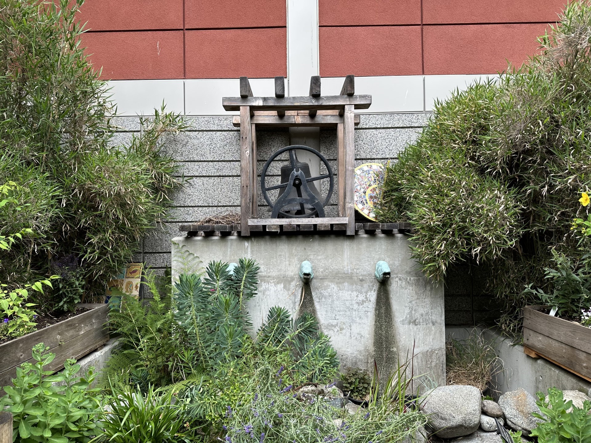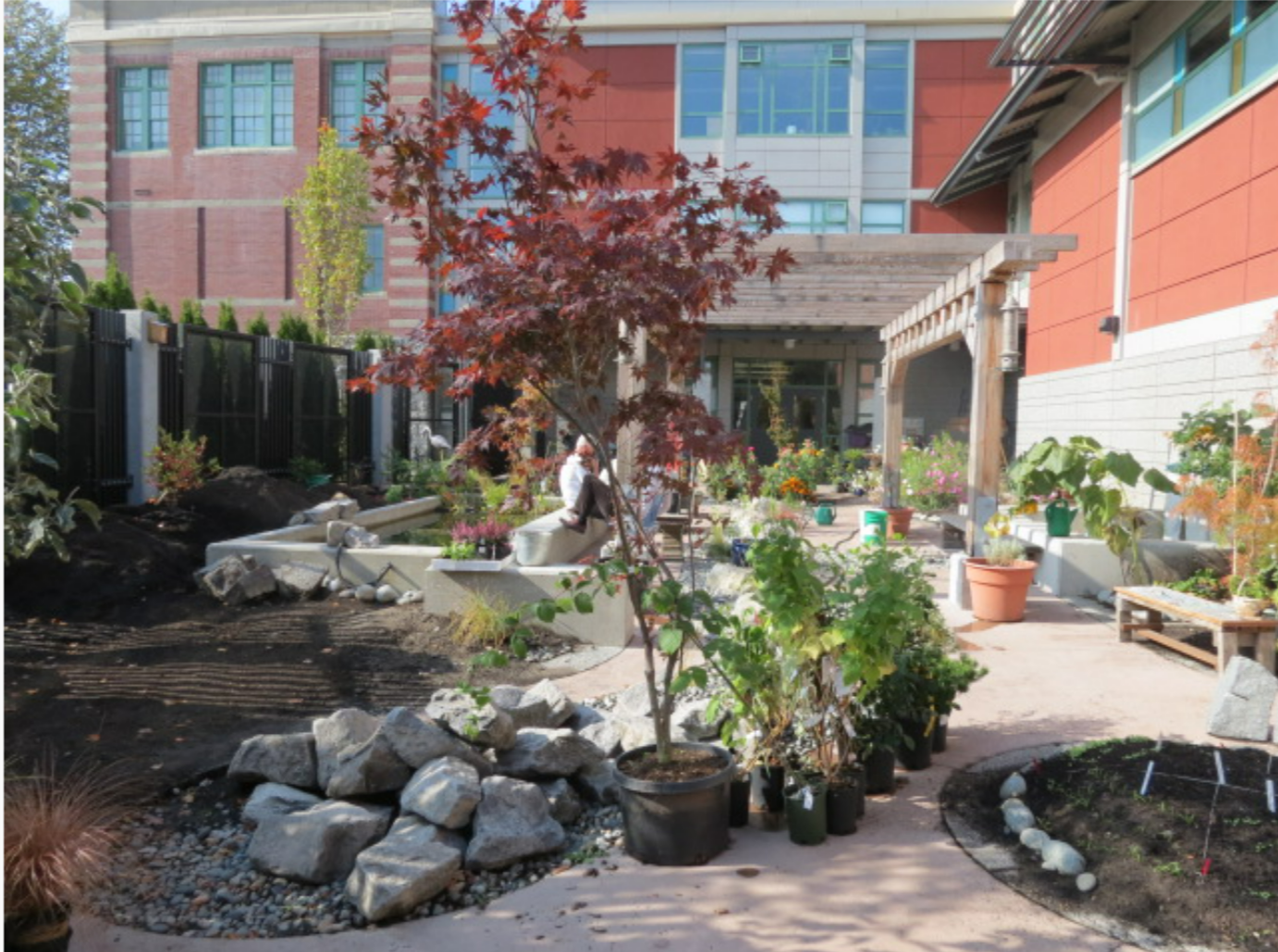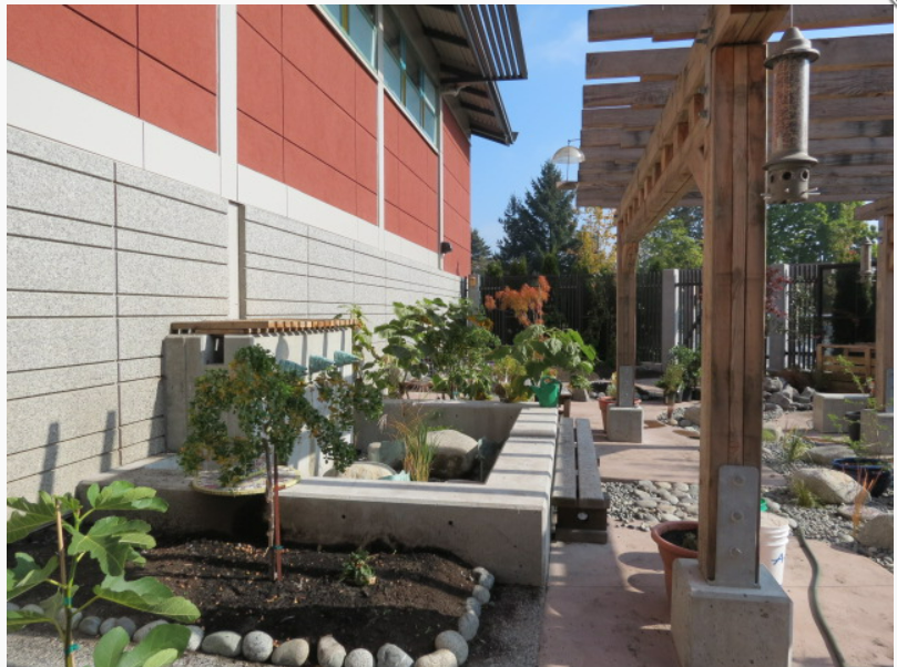 The original garden was demolished during the Ridgeway Elementary School renovation. The Refuge Committee worked with the school district Facilities Manager and the Landscape Architect to develop plans for the new garden. First, the Refuge hard landscaping, pond concrete, and water feature were completed. Next, students, teachers and community members worked to create new garden beds, plant trees, shrubs and a harvest vegetable garden. From here, the team included space for students, compost bins, and garden storage.