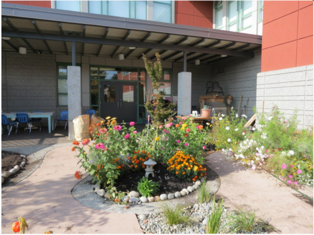 The ever changing gardens included a butterfly garden, a herb garden, a vegetable harvest garden, many perennial gardens, pots for planting bulbs and annuals, and much more. Contributions by many community members included planning and construction of rock walls, pathways, benches, a covered patio, and a garden shed. Community Guardians watered and cared for the garden over the summer months for over l6 years. Compost bins were filled with collections from classrooms and the soil used in garden beds.