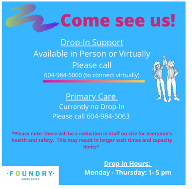 430 pm). In person drop-in is not currently available. Instead of coming to Foundry, please call 604 984 5063. If your concern requires a physical exam, an appointment will be scheduled for you.